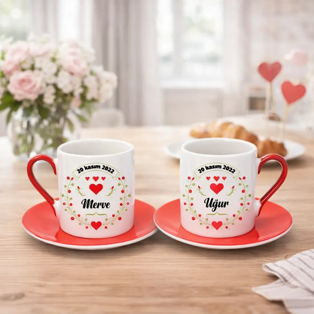 Sevginizi her yudumda hatırlatacak kişiye özel çift fincan seti ile en özel anılarınızı ölümsüzleştirin. İsim ve tarih baskılı tasarımı sayesinde yalnızca size ait eşsiz bir hatıra oluşturabilirsiniz. İster tanışma tarihinizi, ister düğün gününüzü, isterseniz de unutulmaz romantik anılarınızı fincanlarınızda yaşatın.