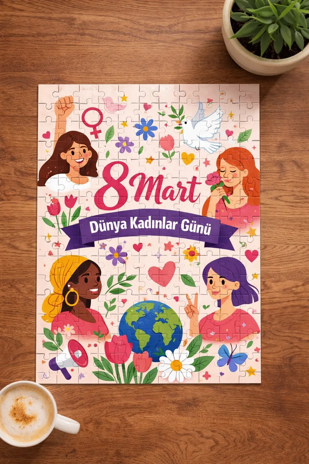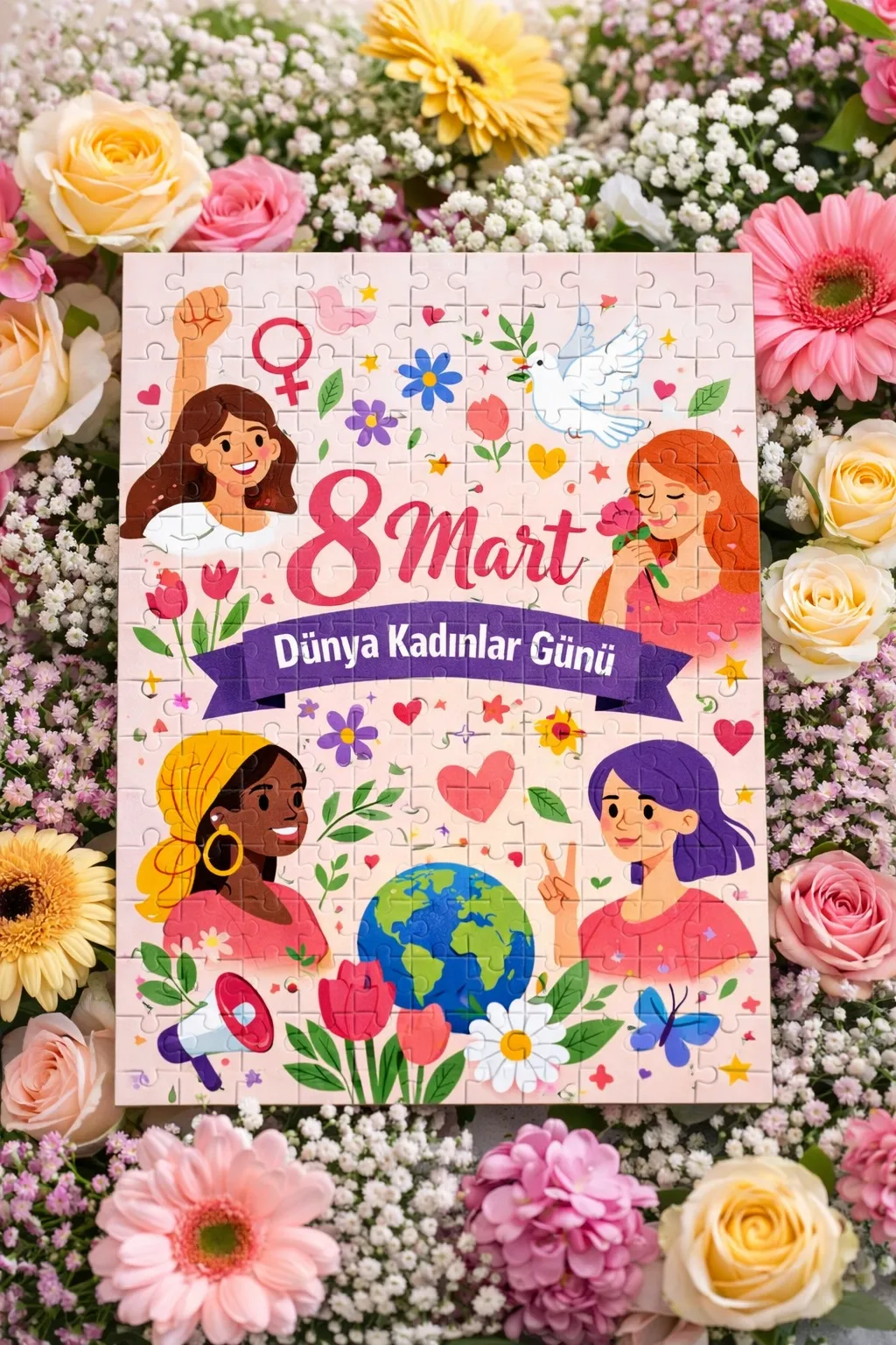 8 Mart Dünya Kadınlar Günü için özel olarak hazırlanan bu A4 boyutundaki 99 parça puzzle, çiçekli ve ilham veren tasarımıyla sevdiklerinize unutulmaz bir hediye sunar.
