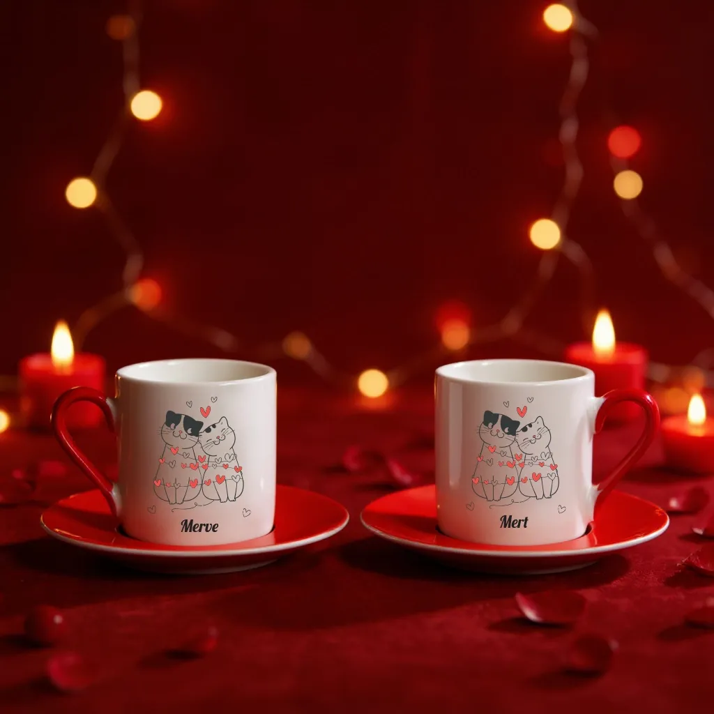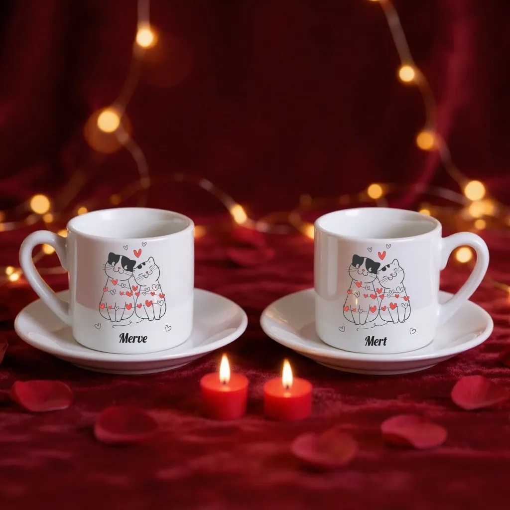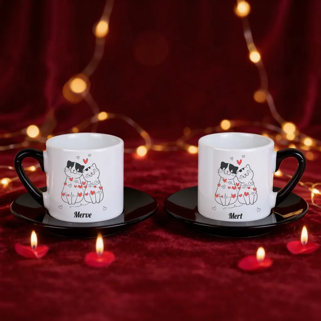 Aşk dolu kedilerin bulunduğu 2'li fincan seti, kahve keyfinizi şirinlik ile taçlandırır.