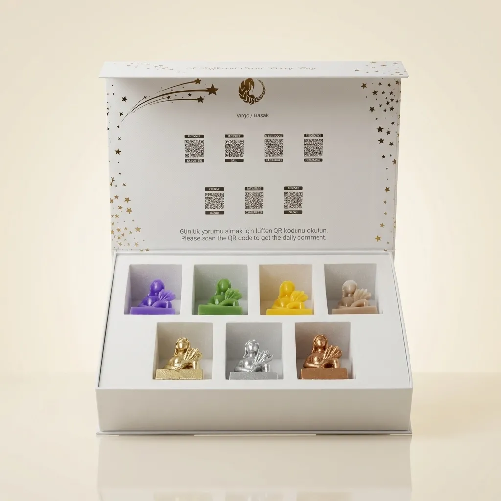 Set içerisinde 7 adet özel tasarım mum ve burç yorum paketi yer almaktadır.