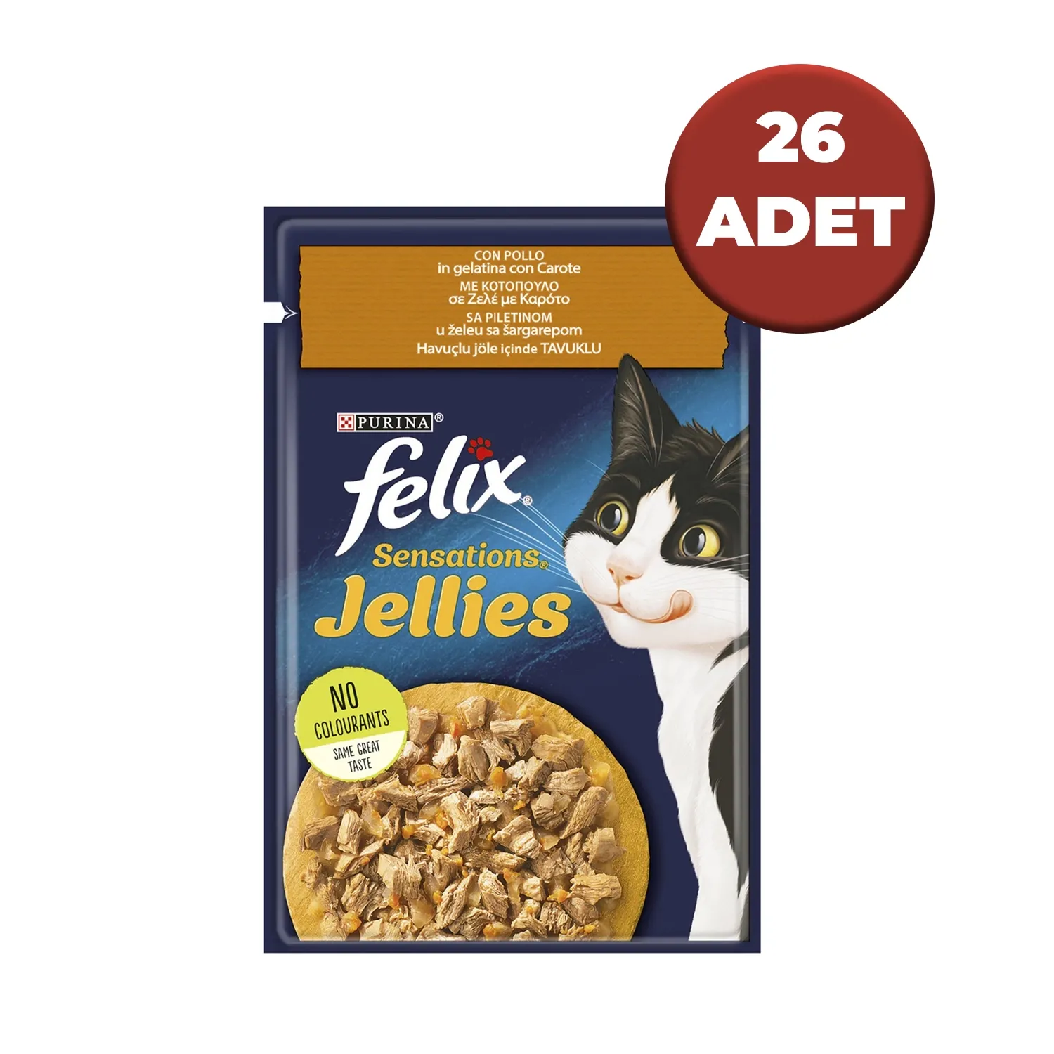 Felix Çifte Lezzet Sensations Tavuklu ve Havuçlu Yaş Kedi Maması 85 Gr x 26 Adet, kedinizin damak tadına hitap eden özel bir formülle hazırlanmıştır. Lezzetli tavuk eti ve besleyici havuç parçalarının birleşimi, kediniz için hem doyurucu hem de keyifli bir öğün sunar.