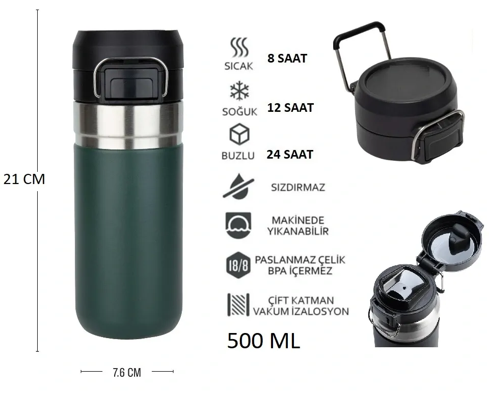Globox 3837 Termos Matara Yeşil 500 ml, taze yeşil rengi ve ergonomik tasarımıyla hem şık hem de işlevsel bir kullanım sunar. Çift katmanlı yapısı sayesinde içeceklerinizi uzun süre sıcak veya soğuk tutar. Sızdırmaz kapağı ile okul, ofis, spor ve günlük kullanım için idealdir.