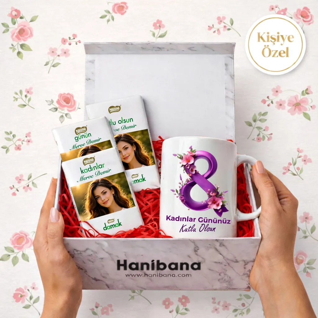 Hanibana'dan özel Kadınlar Günü sürprizi! Kişiye özel kupa ve fotoğraflı çikolata hediye kutusuyla sevdiklerinizi mutlu edin. ?