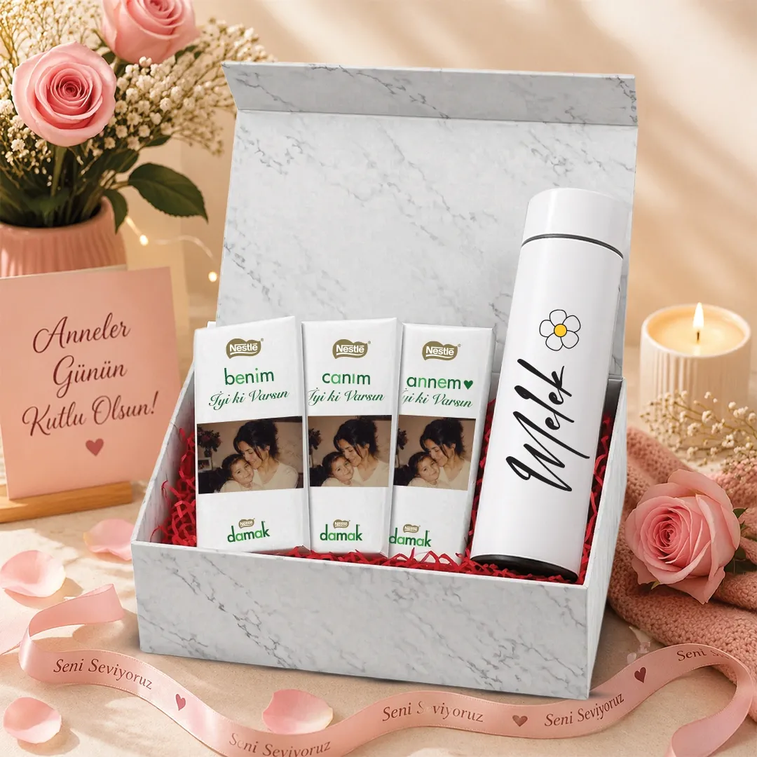 Şık mermer desenli kutusu içerisinde yer alan 3 adet fotoğraflı çikolata ile en güzel anılarınızı ölümsüzleştirebilir, isim baskılı termos ile annenize her gün sizi hatırlatacak bir hediye sunabilirsiniz.