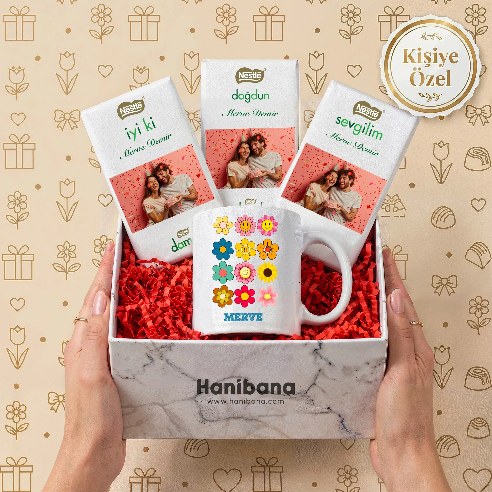 Hanibana'dan sevdiklerinize özel bir hediye: Kişiye Özel Çiçekli Kupa ve Fotoğraflı Çikolata Hediye Kutusu! ???