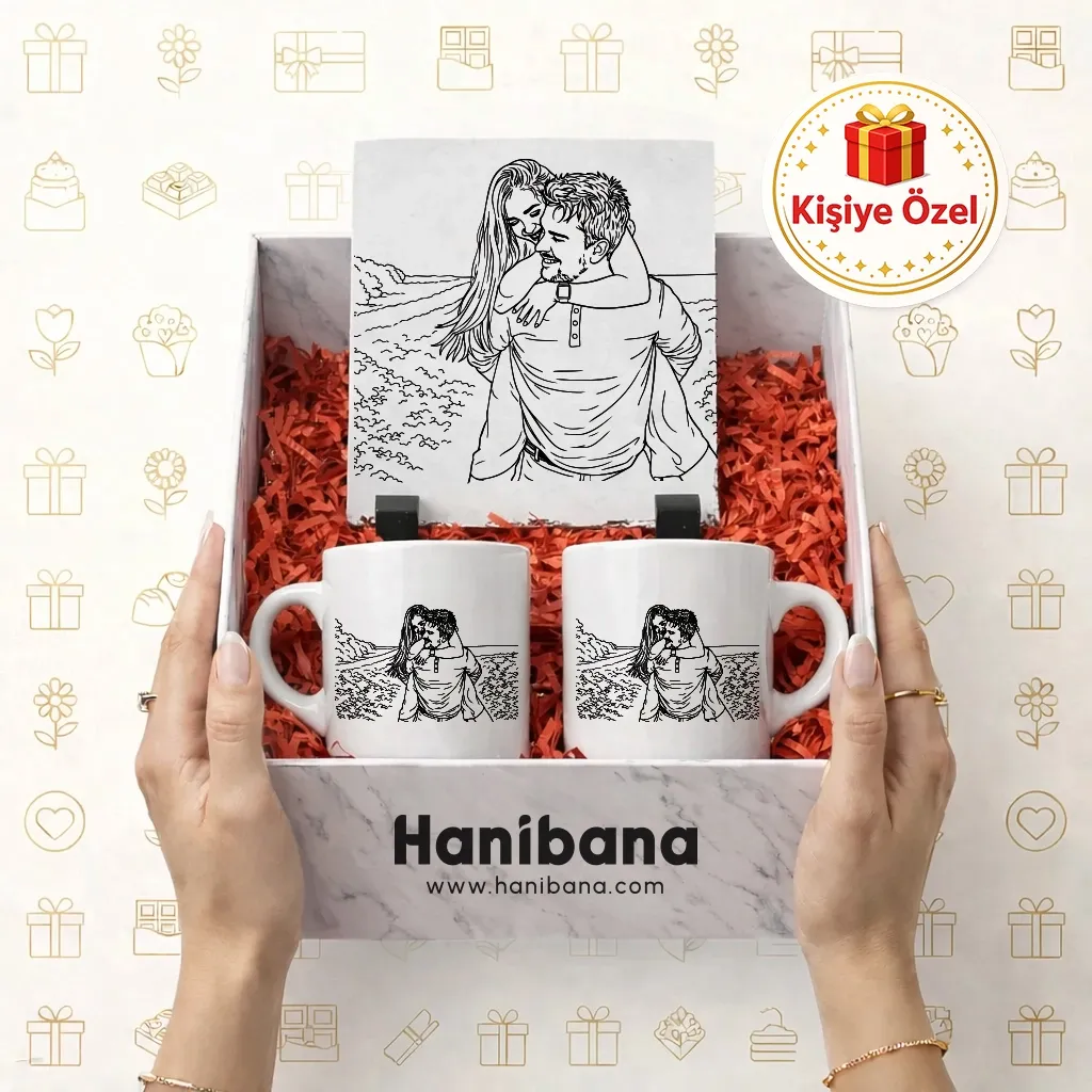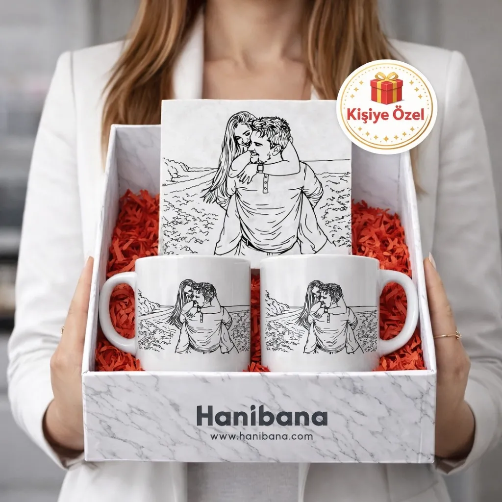 Hanibana'dan özel Lineart Çizim Baskılı Doğaltaş ve 2'li Kupa Hediye Seti, sevdiklerinize özel ve anlamlı bir hediye seçeneği sunuyor.