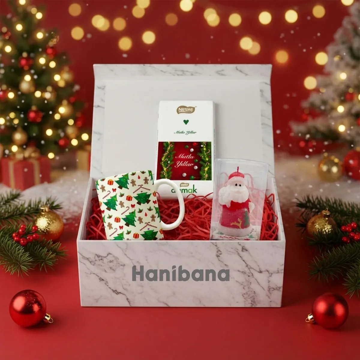 Setin içerisinde; yılbaşı temalı kupa, dekoratif Noel Baba mumu ve yeni yıl çikolatası yer alır.