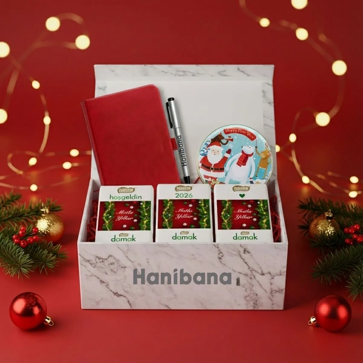 Mermer desenli premium kutusu ve yılbaşı detaylarıyla hem kurumsal hediyeler hem kişisel sürprizler için ideal bir seçenektir.