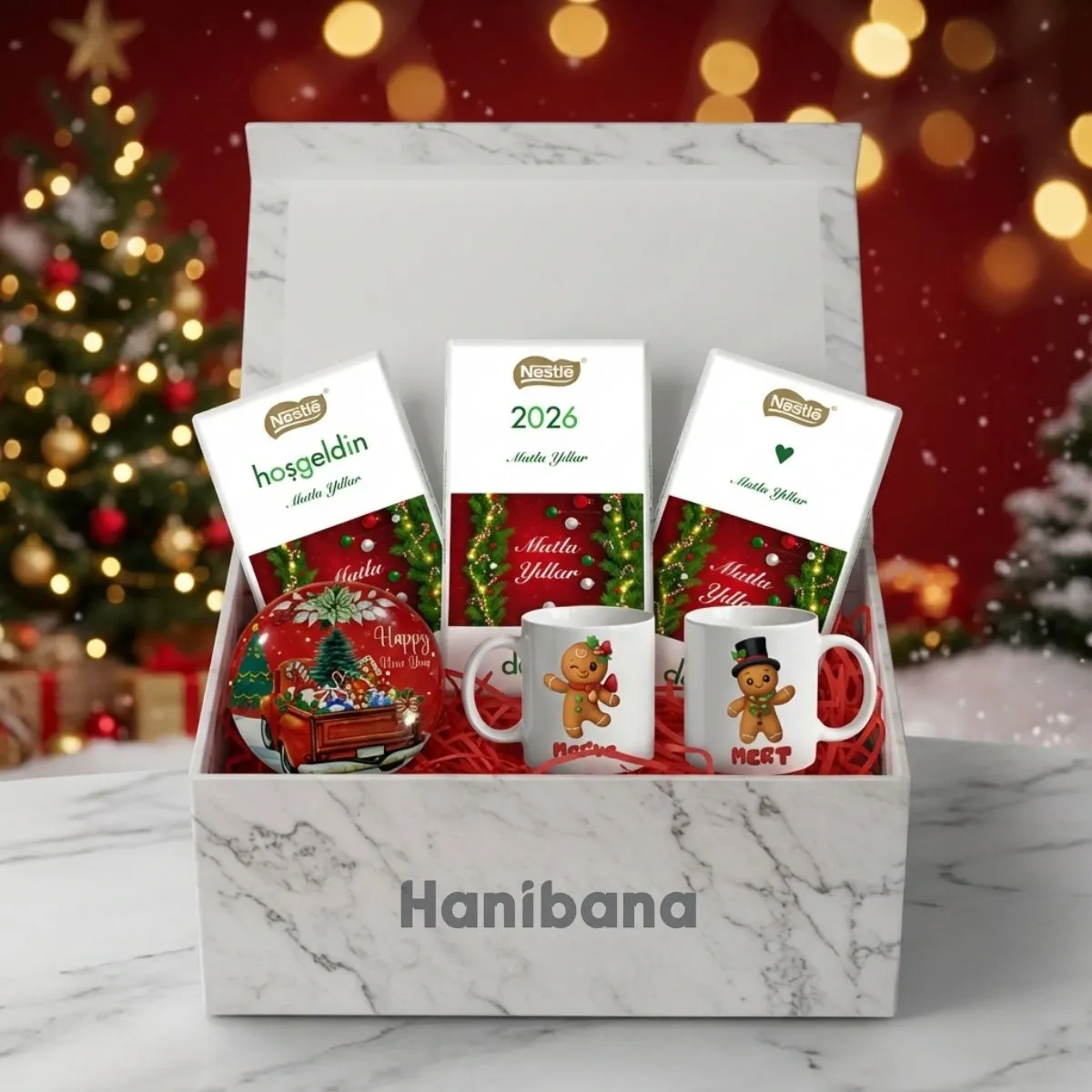 Bu özel kutu; 3 yeni yıl temalı çikolata, 2 adet yılbaşı konseptli kupa ve dekoratif yılbaşı mum objesiyle özenle hazırlanmıştır.