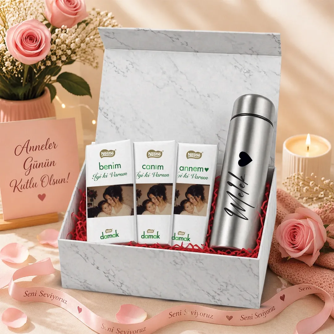 Kişiye Özel Anneler Günü Fotoğraflı Çikolata & İsimli Termos Hediye Kutusu