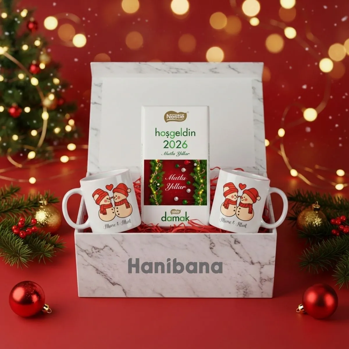 Mermer desenli premium kutusu, kırmızı yılbaşı dolgusu ve çift kupa tasarımının zarafetiyle hem romantik hem de keyifli bir hediye alternatifi sunar.